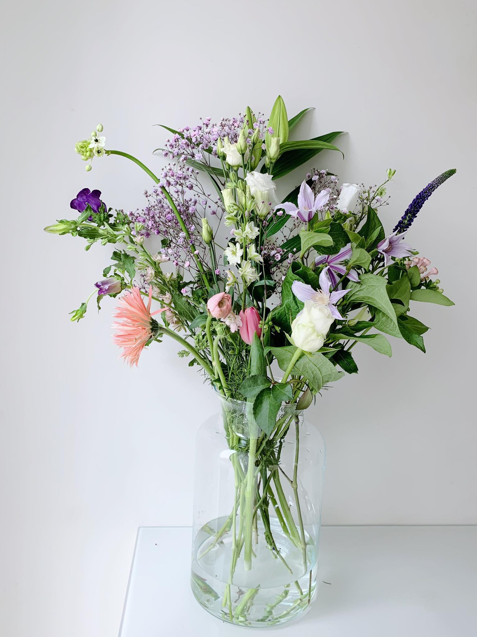 Witte roos - germini sensini - clematis - tulp - ranonkel - bouvardia - veronica - donkerpaarse en witte campa nula - lisianthus - japanse lelie - gypsophilla - wilde delphinium - ornithogalum of vogelmelk - dianthus