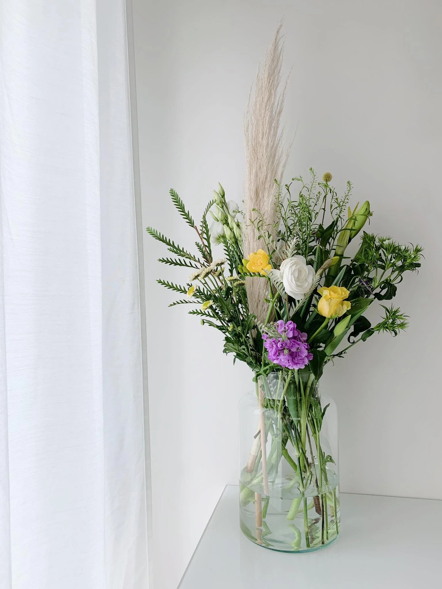 Paasweek: Vorige week gingen we de Paasvakantie in met een boekett vol kleur. Deze week gaan we voor de klassieke ‘paastinten’ in een modern jasje. Wit, geel, fris groen en lila.